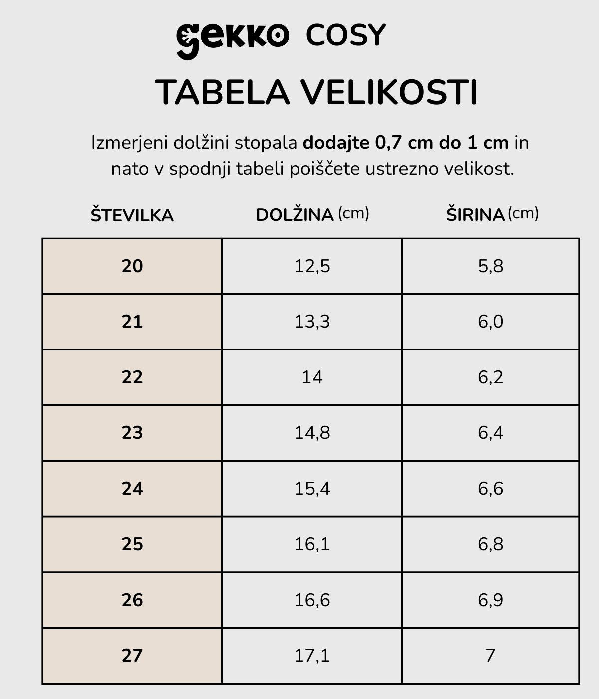 TABELA VELIKOSTI ZA JESENSKE GEKKO COSY ČEVLJE