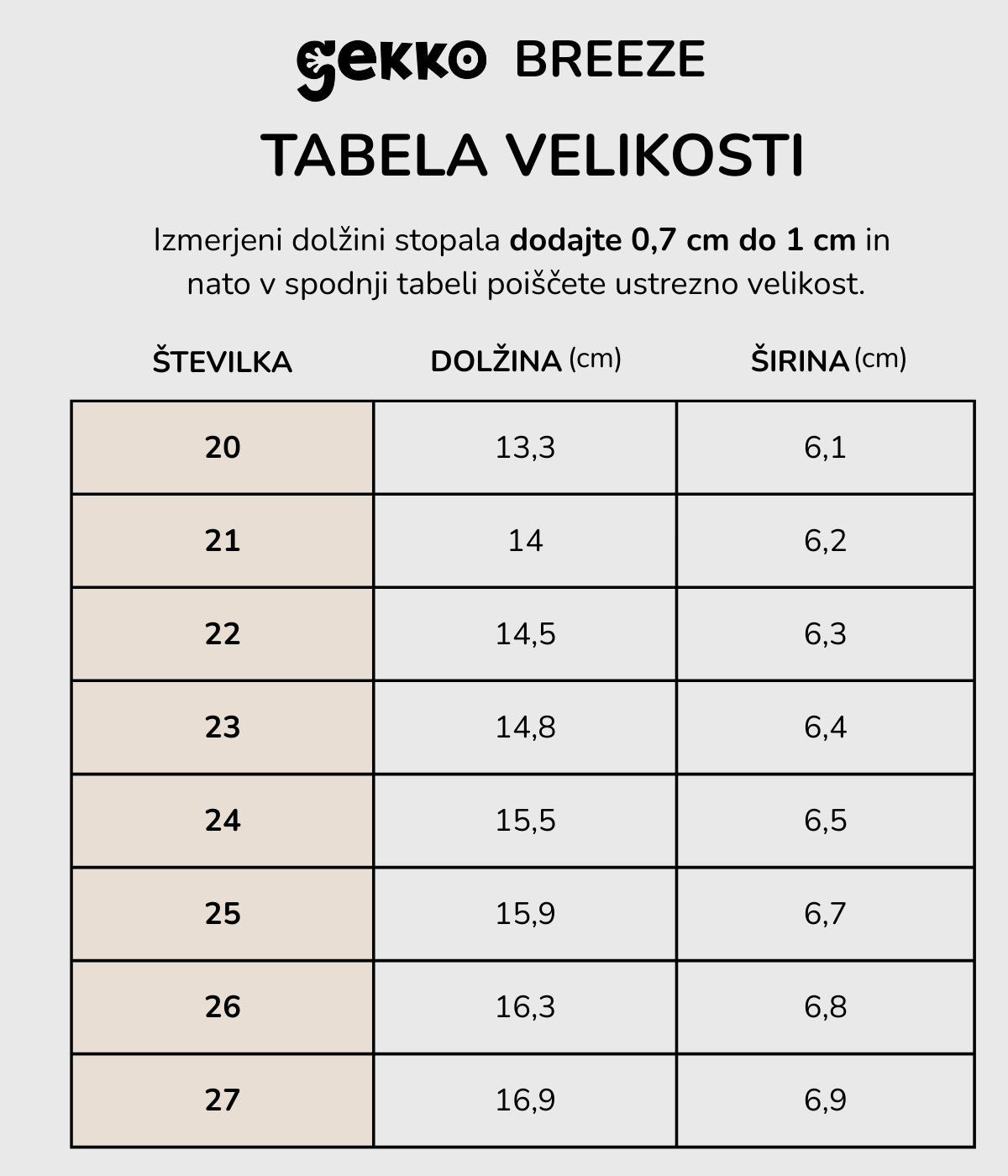 TABELA VELIKOSTI ZA POLETNE GEKKO BREEZE ČEVLJE